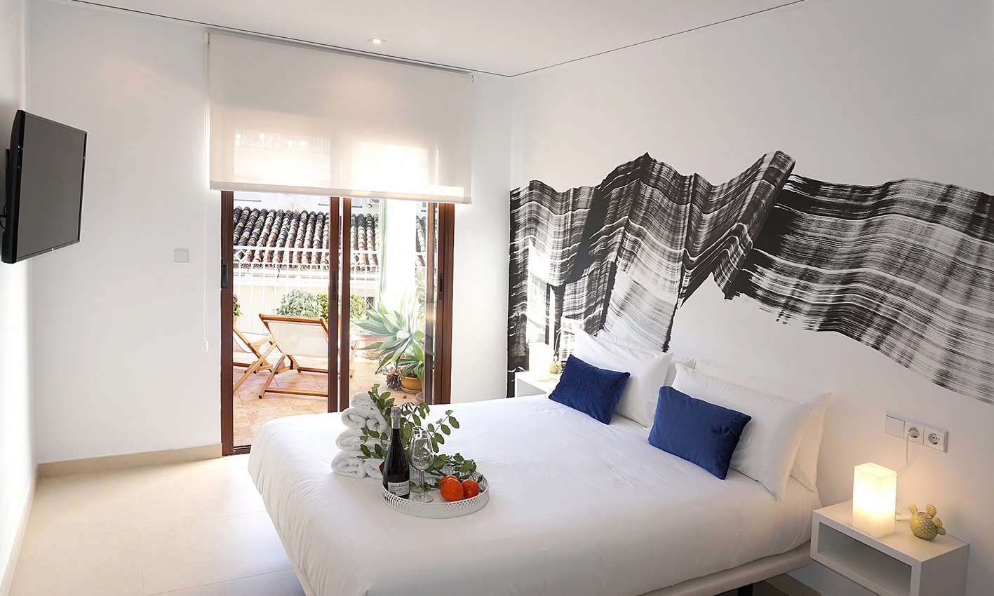 Nuestro hotel «solo adultos» a un paso de Dénia destaca por sus cinco habitaciones cuidadosamente decoradas, algunas de ellas con terraza privada.